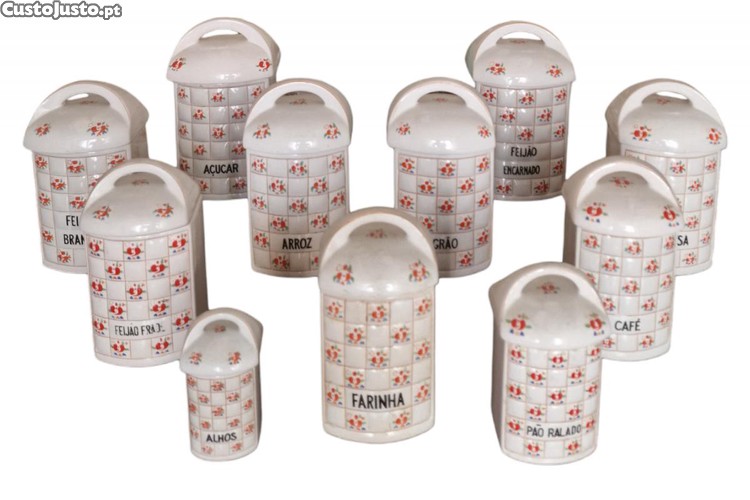 Conjunto de potes de cozinha em faiança, marcados da Fábrica de Louças de Sacavém. Decoração pintada à mão com motivos florais.
