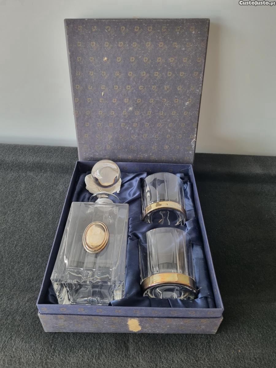 - Conjunto de whisky constituído por garrafa e 2 copos de cristal com acabamento em prata.