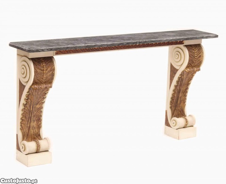 Consola em madeira e mármore do séc. XX. Tampo em mármore cinza, assente sobre dois suportes em forma de voluta, em madeira entalhada e pintada.