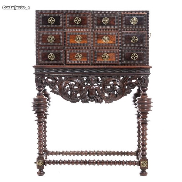 Contador com trempe Português, séc.XIX, pau-santo entalhado com tremidos, com oito gaveta simulando doze, mesa com pernas e travejamento torneados, saial vegetalista e querubim, ferragens em latão recortado e dourado.