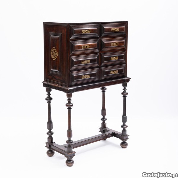 Contador com trempe em pau santo, de sete gavetas simulando oito, ferragens em metal e trempe de pernas torneadas.