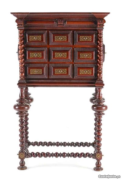 Contador em pau-santo, com guarnições de tremidos, pilastras laterais torneadas, com sete gavetas, simulando nove. Trempe torneada. Portugal.
