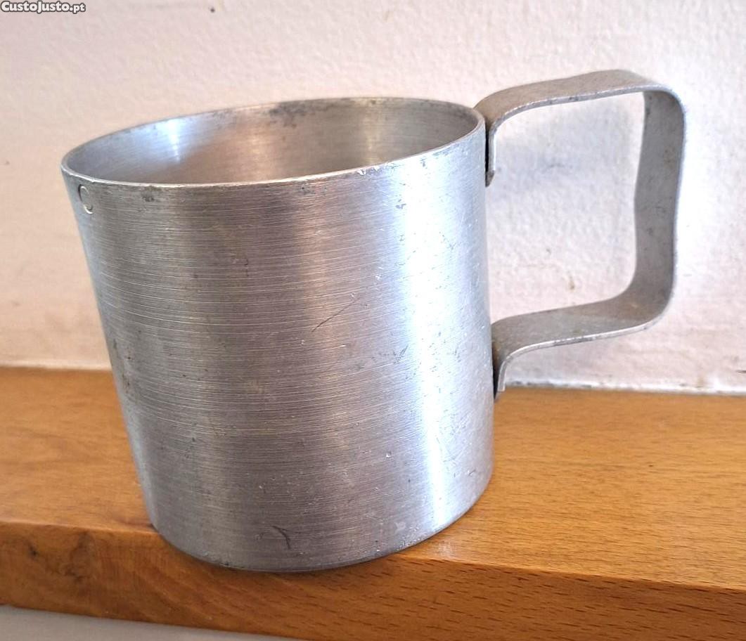 Copo de medidas para líquidos em alumínio, de 1/2 litro, com asa, antigo, em bom estado, com a altura de 8,5cm e o diâmetro de 9cm.