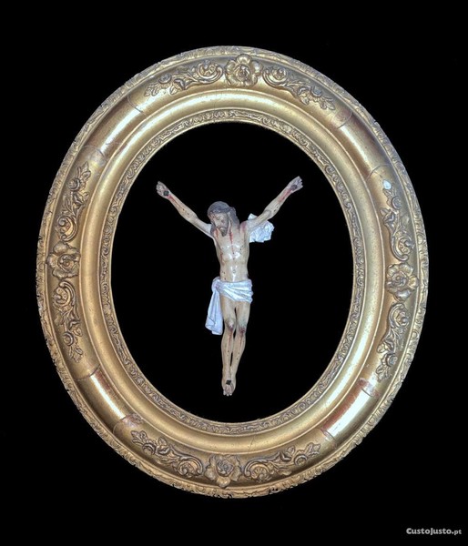 Cristo na posição de crucificado, escultura de madeira pintada, com moldura oval em madeira entalhada e dourada. Séc. XIX.
