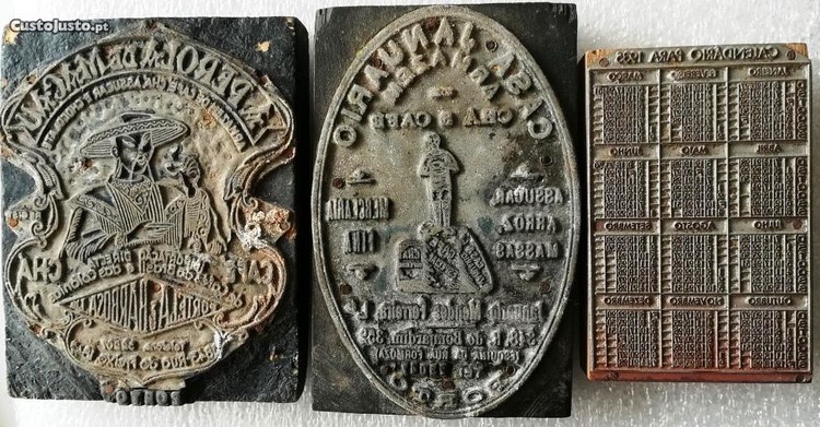 Conjunto de 3 cunhos tipográficos, colocados sobre base de madeira: um da "Casa Januário", outro da "Casa Pérola de Macau", ambas lojas históricas e ainda existentes no Porto, e um terceiro que é um calendário de 1935. O maior mede 2x12x9 cm.