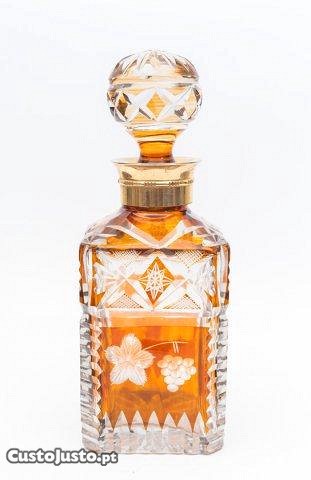 Decanter em cristal doble em tons de castanho e translúcidos, moldado, lapidado e facetado com armação em liga metálica dourada no gargalo, trabalho europeu do séc. XX. Corpo de formato paralelepipédico ao alto, decorado com parras e uvas, reservas de motivos florais estilizados, intercalados por caneladuras transversais e verticais, formando um desenho repetitivo. Rolha de formato esférico, decorada com motivos geométricos.