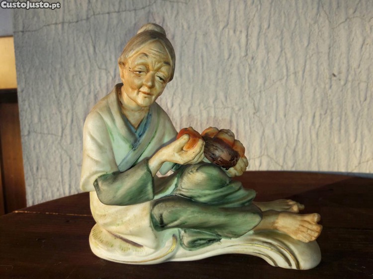 Antiga e ternurenta estatueta em biscuit pintado à mão representando uma anciã japonesa vendendo fruta. Estado impecável. Cerca de 20 cm de comprimento.