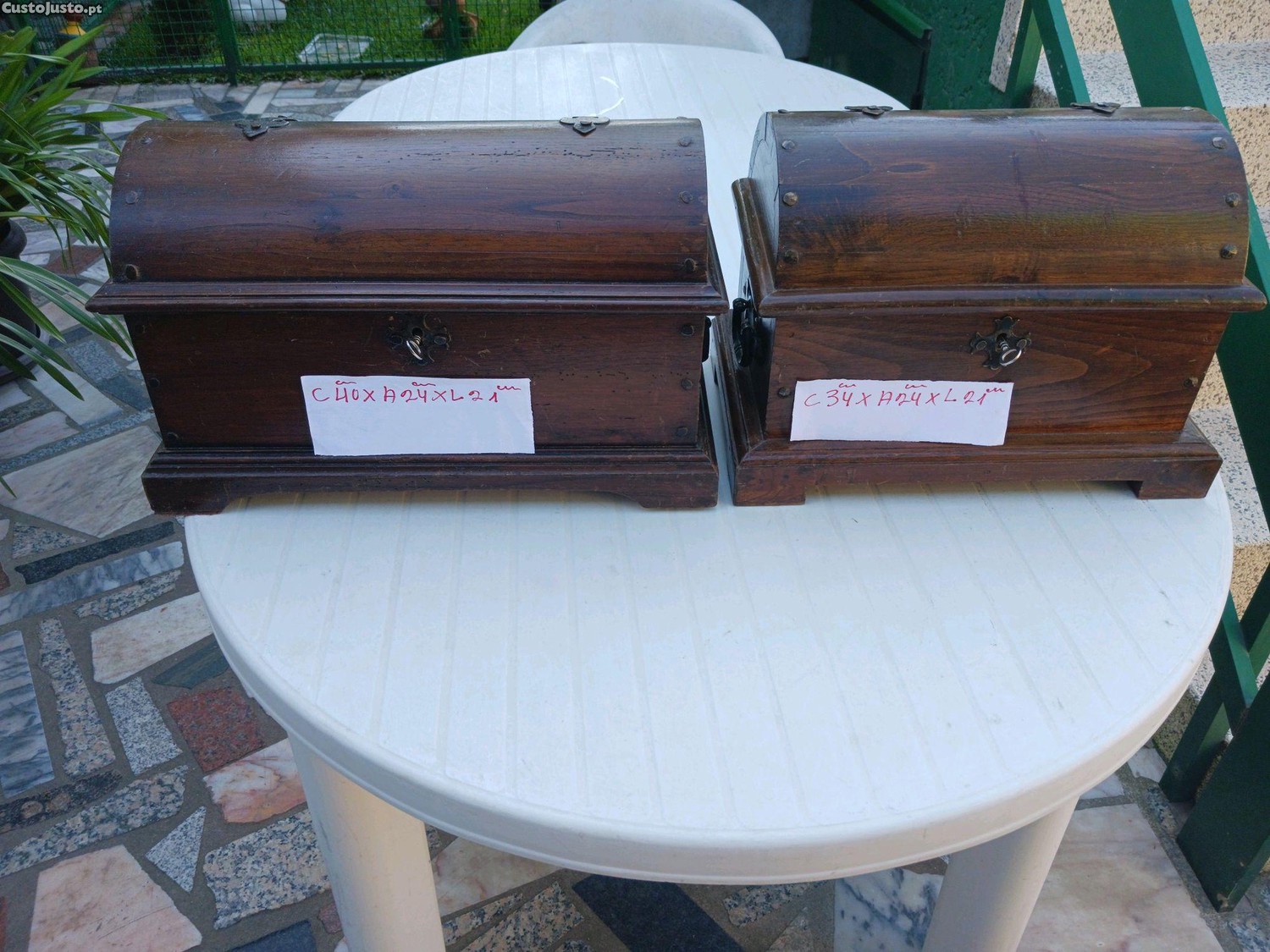 Duas arcas báus em madeira antigas, com decoração em metal,com chave.Medidas uma C 40 cm x A 24 cm x L 21, outra C 34 cm x A 24 cm x L 21 cm bonitas para colecionadores