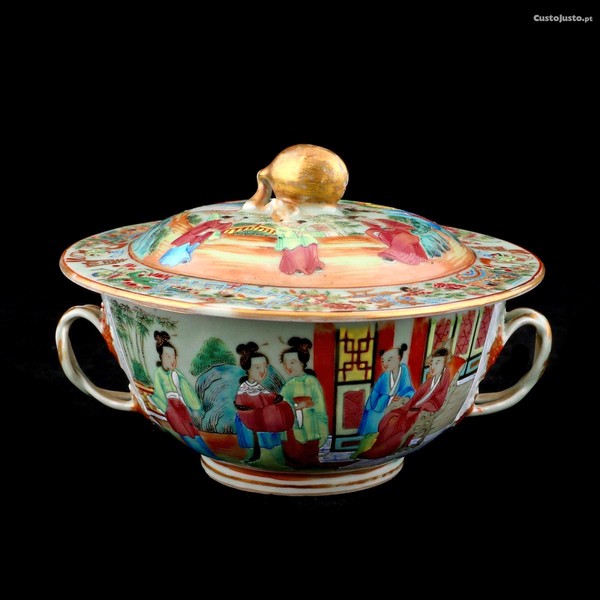 Porcelana chinesa "celadon" para exportação, Dinastia Qing, reinado Daoguang / Xianfeng (1821/1861), decoração policromada e dourada, em tonsda família rosa com cenas do quotidiano, pássaros e flores. Pomo da tampa em forma de fruto.