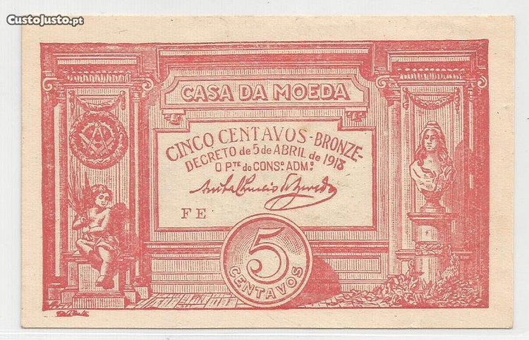 Preço: 30 €Espadim - Cédula de 5 Centavos de 1918 - FE