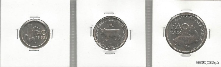 Colecção completa das 3 (três) moedas de 2$50, 5$00 e 25$00 de 1983 em cupro-niquel, comemorativas da FAO, Dia Mundial da Alimentação, no estado de conservação de (Soberbas). Por favor veja as imagens. Custos de envio 5 euro para uma ou mais peças de colecção.