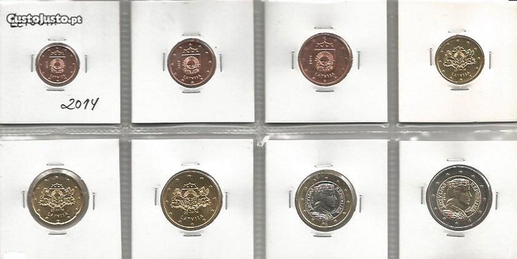 Colecção completa das 8 (oito) moedas correntes do ano 2014 da Letónia, no estado de conservação de (Novas). Custos de envio 5 euro para uma ou mais peças de colecção.