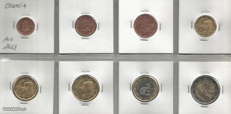 Colecção completa das 8 (oito) moedas correntes do ano 2023 da Croácia, no estado de conservação de (Soberbas). A Croácia aderiu à moeda única desde Janeiro deste ano de 2023 sendo estas as primeiras moedas de Euro deste País. Custos de envio 5 euro para uma ou mais peças de colecção.