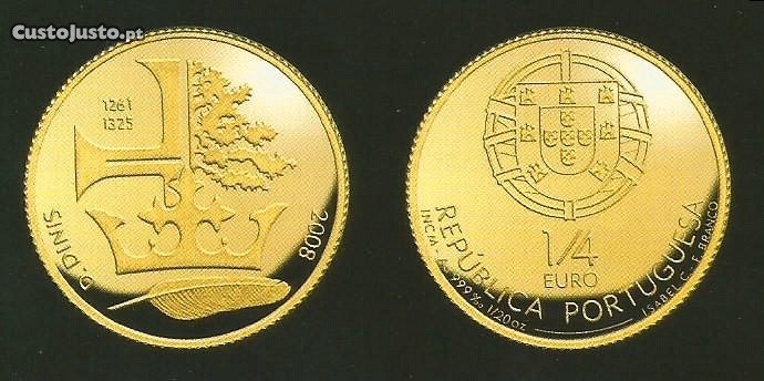 Moeda de 1/4 euro de 2008 do Rei D. Dinis, em ouro, acabamento (Flôr de Cunho), na carteira original da Imprensa Nacional - Casa da Moeda. Foram cunhados 30.000 exemplares. Por favor veja as imagens.
