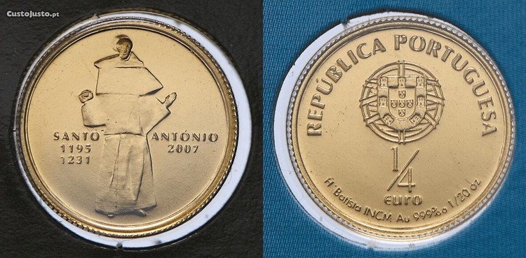 Moeda de 1/4 euro de 2007 de St António, em ouro, acabamento (Flôr de Cunho), na carteira original da Imprensa Nacional - Casa da Moeda. Foram cunhados 30.000 exemplares. Por favor veja as imagens.