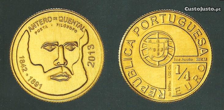 Moeda de 1/4 euro de 2013 de Antero de Quental, em ouro, acabamento (Flôr de Cunho), na carteira original da Imprensa Nacional - Casa da Moeda. Foram cunhados 15.000 exemplares. Esta moeda encontra-se esgotada praticamente desde o seu lançamento. Por favor veja as imagens.