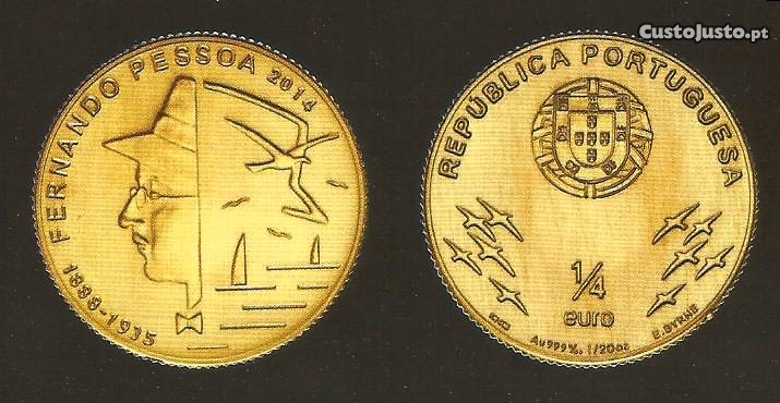 Moeda de 1/4 euro de 2014 de Fernando Pessoa, em ouro, acabamento (Flôr de Cunho), na carteira original da Imprensa Nacional - Casa da Moeda. Foram cunhados 15.000 exemplares. Esta moeda está esgotada na Casa da Moeda quase desde o seu lançamento. Por favor veja as imagens.