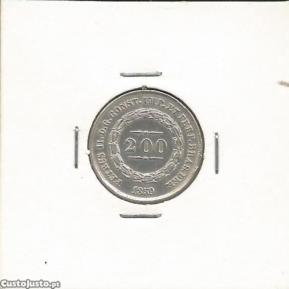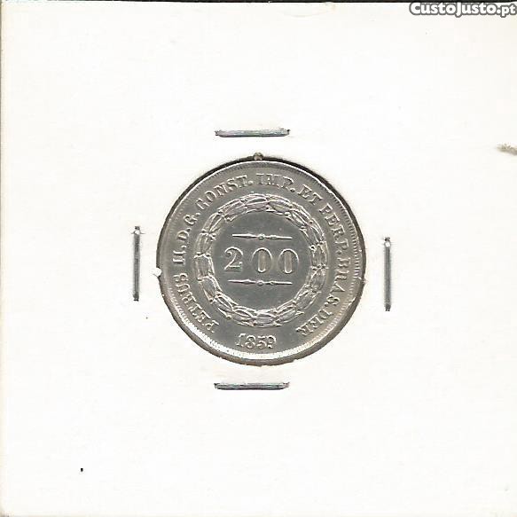 Moeda de 200 Reis de 1859 do Rei D. Pedro II do Brasil, em Prata, no estado de conservação de (Bela). A moeda está linda. Por favor veja as imagens. Estas moedas em prata do Brasil vão sendo cada dia mais dificeis de encontrar. Coleccione moedas por datas, por temas, por Países, ou por metais.