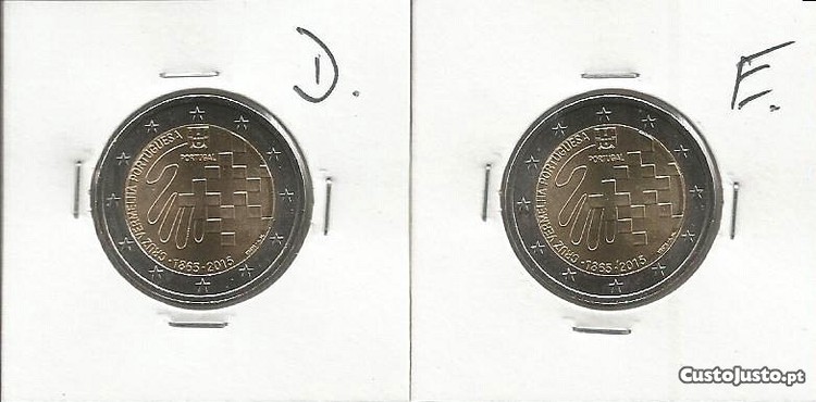 2 (duas) moedas de 2 euro de 2015, D (direita) e E (Esquerda) comemorativas dos 150 anos da Cruz Vermelha Portuguesa, no estado de conservação de (Soberbas). Por favor veja as imagens. Custos de envio 5 euro para 1 ou mais peças de colecção.