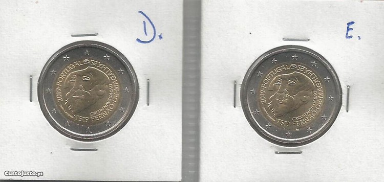 2 (duas) moedas de 2 Euro de 2019 de Portugal, D e E (Direita e Esquerda), comemorativas do quinto centenário da viagem de circum-navegação de Fernão de Magalhães, no estado de conservação de (Soberbas). Por favor veja as imagens. Custos de envio 5 euro para uma ou mais peças de colecção.