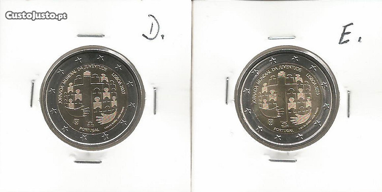 2 (duas) Moedas de 2 Euro de 2023 de Portugal, D (Direita) e E (Esquerda) comemorativas da (Jornada Mundial da Juventude em Portugal). Por favor veja as imagens. Faça uma visita aqui às nossas outras peças de colecção de Espadim. Envie este convite a um amigo. Custos de envio para uma ou mais peças de colecção, 5 euro.