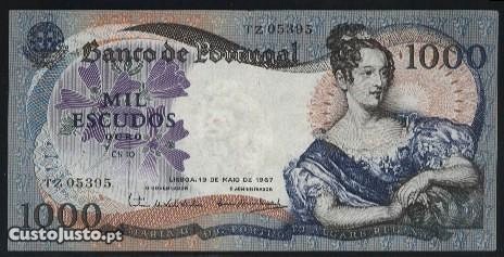 Nota de 1.000$00 chapa 10 de 19/5/1967, de D. Maria II, Rainha de Portugal, com o numero (TZ 05395), no estado de conservação de (Mbc a Mbc+). A nota está linda. Por favor veja as imagens. Custos de envio 5 euro para uma ou mais peças de colecção.