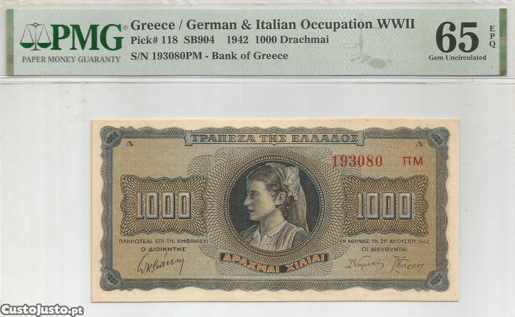 Nota de 1.000 Dracmas de 21/8/1942 da Grécia, com o número (193080 TTM), no estado se conservação de (Nova). (Ref. 118). Por favor veja as imagens. Esta Nota, é Certificada e, neste estado de conservação, pode ser considerada Escassa. A qualidade tem sempre OUTRO valor. Coleccione Notas por temas, por datas ou por Países. Custos de envio para 1 ou mais peças de coleção, 5 euro.