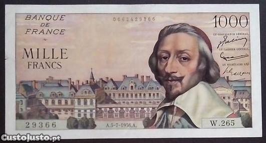 Nota de 1.000 Francos de 5 de Julho de 1956 de França, (Richelieu), com o numero (29366), (W.265), no estado de conservação de (Mbc a Mbc+). (Ref. 64). Por favor veja as imagens. A nota está espectacular. Atenção, as notas Francesas, normalmente apresentam pequenissimos furos de alfinete.