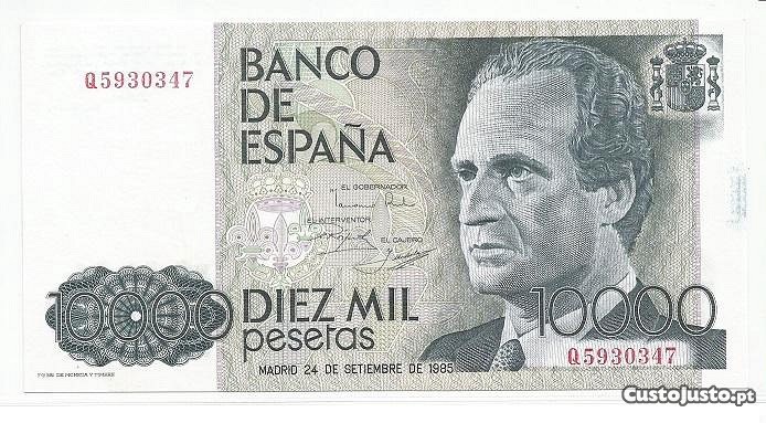 Nota de 10.000 pesetas de 24/9/1985 de Espanha, com o numero (Q 5930347), no estado de conservação de (Nova). Por favor veja as imagens desta escassa nota Espanhola que por trás tem o Principe Carlos, actual Rei de Espanha. Atenção, custos de envio 5 euro para uma ou mais peças de colecção.