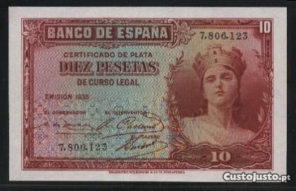 Nota de 10 pesetas de 1935 de Espanha, com o numero (7,806,123), (sem série), no estado de conservação de (Nova). A nota esta rigorosamente nova. Por favor veja as imagens. Custos de envio 5 euro para uma ou mais peças de colecção.