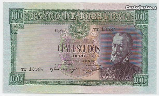 Nota de 100$00 chapa 6 de 28/10/1947 de Pedro Nunes, no estado de conservação de (Bela), com o numero (TT 13584). Esta é a primeira data desta chapa e é também a mais difícil de encontrar principalmente neste estado de conservação. Por favor veja as imagens. Custos de envio 5 euro para 1 ou mais peças de colecção.