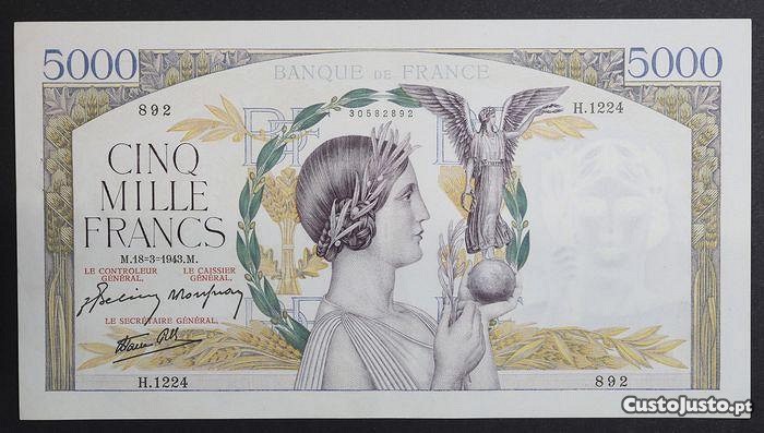 Nota de 5.000 francos de 18 de Março de 1943 de França, (vitória), com o numero (892), (H.1224), no estado de conservação de (Bela). (Ref. 41). A nota está espectacular e é mais uma nota que é muito dificil de encontrar neste estado de conservação. Por favor veja as imagens.