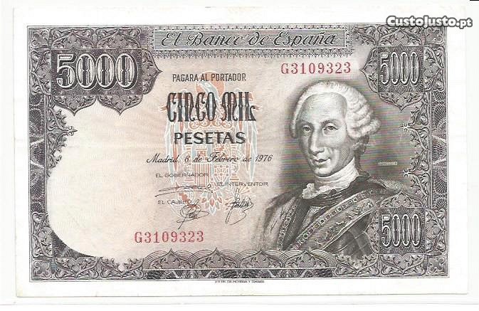 Preço: 135 €Espadim - Nota de 5.000 Pesetas de 1976 - Espanha