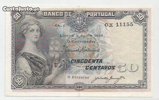 Nota de 50 centavos, chapa 1, de 5 de Julho de 1918 (com letras a numeros numa só Linha), (CX 11155), no estado de conservação de (Bela a Q. Nova). Mais uma nota em excelente estado de conservação que também por isso pode ser considerada escassa. Por favor veja as imagens. A qualidade tem sempre outro valor.
