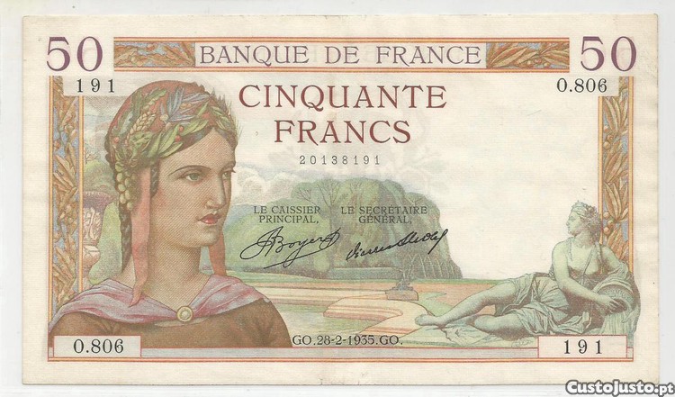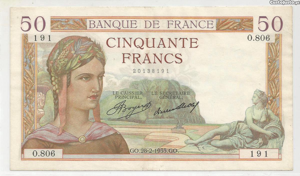 Nota de 50 Francos de 28 de Fevereiro de 1935 de França, com o numero (O.806) (191), no estado de conservação de (Mbc+ a Bela). (Ref. 18). A Nota está linda. Atenção, as notas Francesas, a maioria das vezes apresentam pequenissimos furos de alfinete. Por favor veja as imagens. A qualidade tem sempre outro valor.