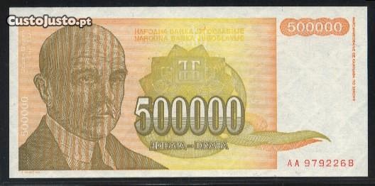 Nota de 500.000 (quinhentos mil) dinara de 1994 da Jugoslávia com o número (AA 9792268). Por favor veja as imagens. Estas notas num futuro muito próximo e neste estado de conservação, serão escassas. Custos de envio 5 euro para 1 ou mais peças de colecção. Coleccione Notas por Datas, por Países, por Temas. Divirta-se investindo.