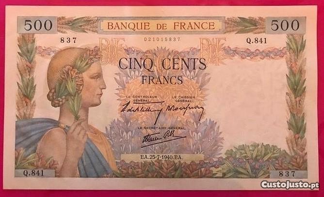 Nota de 500 francos de 25 de Julho de 1940 de França, numero (837), (Q.841), no estado de conservação de (Q. nova a nova). (Ref. 32). Por favor veja as imagens. A nota está espectacular. Atenção, as Notas Francesas, a maioria das vezes apresentam pequeníssimos furos de alfinete.