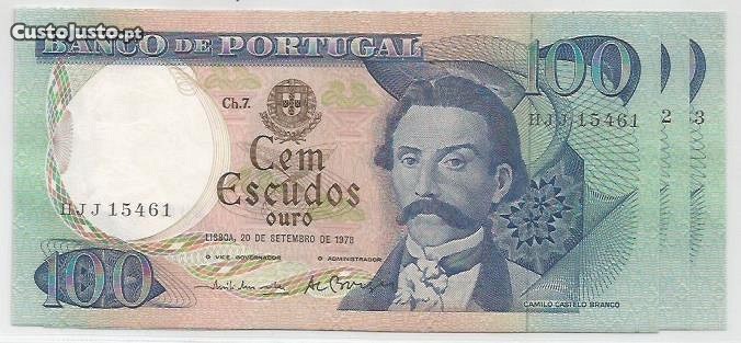 3 (três) notas de 100$00 de 1978 chapa 7 de Camilo Castelo Branco, com os 3 números seguidos (Hjj 15461, 15462 e 15463), no estado de conservação de (Novas) Por favor veja as imagens. Custos de envio 5 euro para 1 ou mais peças de colecção.