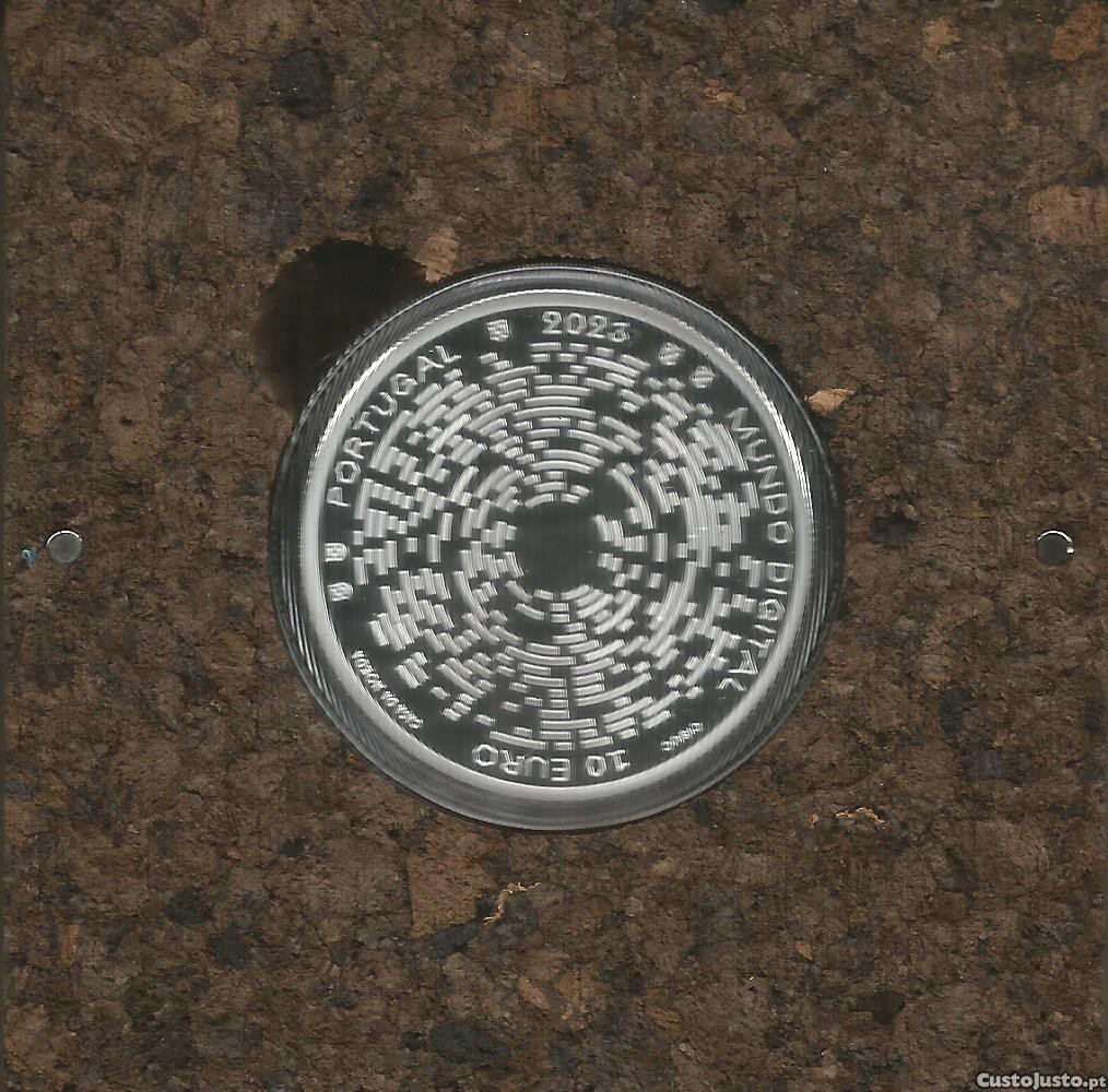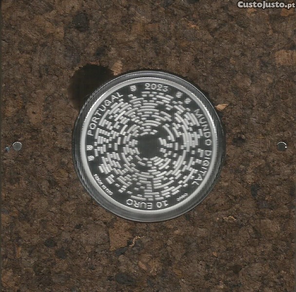 Moeda de 10,00 euro de 2023 em Prata, com acabamento PROOF, no estojo original da INCM (Imprensa Nacional - Casa da Moeda), comemorativa do (Mundo Digital). Esta moeda só foi cunhada em acabamento PROOF. Foram cunhados 4.000 exemplares numerados. Esta moeda é a primeira criada no Mundo desenhada por (IA - inteligência Artificial). Uma face da moeda, o reverso, é desenhada por IA para Humanos, a outra face, o anverso, é desenhada por Humanos para Máquinas. Por favor veja as imagens. Custos de envio 5,00 euro.