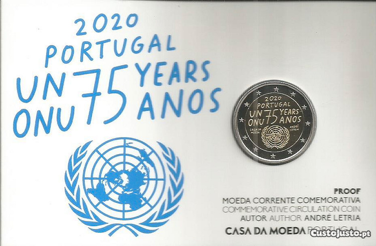 Moeda de 2 euro de 2020 de Portugal, comemorativa dos 75 anos da ONU, com acabamento Proof, na carteira original da Imprensa Nacional - Casa da Moeda. Atenção, foram cunhados só 5.000 (cinco mil) exemplares. Por favor veja as imagens. Custos de envio 3 euro. Atenção, custos de envio 5 euro para uma ou mais peças de colecção.