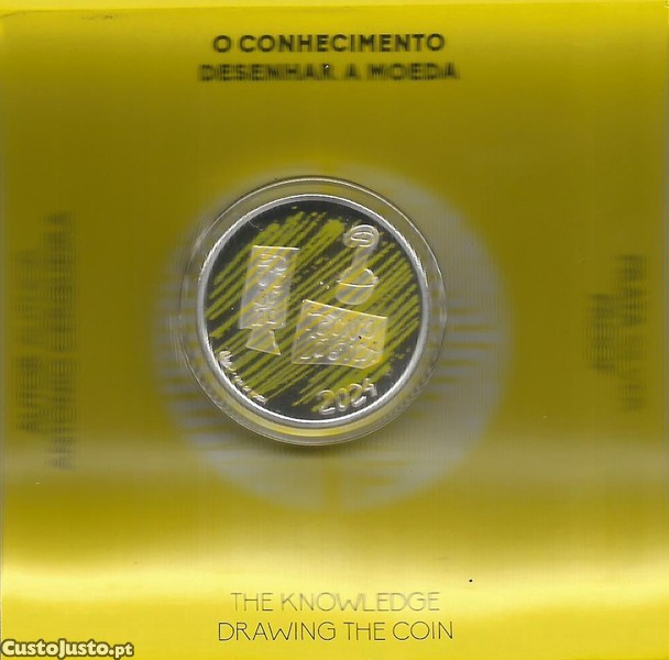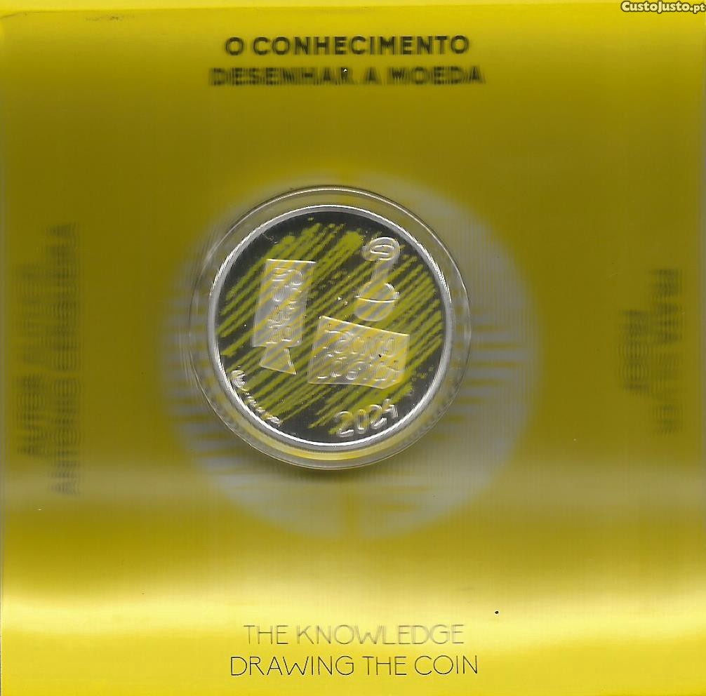Moeda de 5,00 euro de 2024 em Prata, com acabamento PROOF, no estojo original da Imprensa Nacional - Casa da Moeda (INCM). (Colorida). Comemorativa da (4 edição do concurso Desenhar a Moeda", com o tema O Conhecimento, em parceria com a INCM e a comunidade escolar do Alto Minho, que envolveu estudantes de 11 agrupamentos escolares. Foram cunhados 2.000 (Dois Mil) Exemplares numerados. Custos para 1 ou mais peças de colecção, 5 euro.