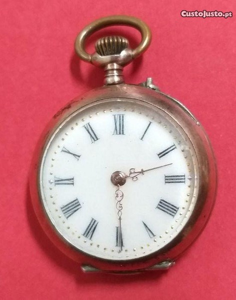 Relógio de Bolso antigo de Senhora, caixa em Prata (1850 a 1900). Corda mecânica manual, tampas em prata de 800, pesa cerca de 625 gramas, tem de diâmetro cerca de 32 milímetros, 40 mm com coroa, sem arranhões visíveis, com algum desgaste no sitio de onde abrem as tampas. A hora é ajustada usando a coroa. Está a trabalhar perfeitamente. Lindo relógio de bolso para os coleccionadores mais sofisticados. Custos de envio 10,00 euro.