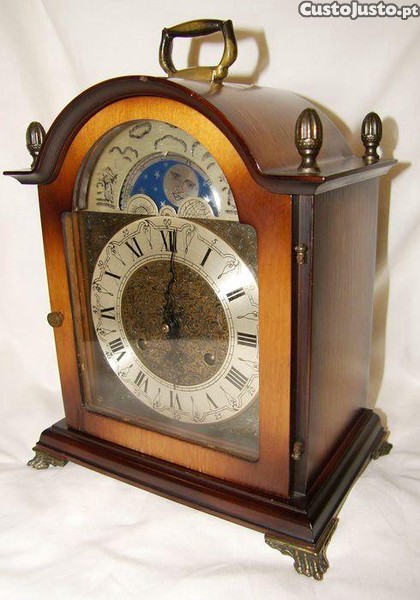 Relógio Alemão de mesa em madeira de 1974, de corda, movimento mecânico de oito dias, duplo gong às horas e meias horas. Mostrador gravado com exposição de fases da lua. Mecanismo em perfeito funcionamento. Com as medidas, largura 22,5 cm, altura 29 cm, profundidade 15 cm. Com chave incluida e em excelente estado geral de conservação. Por favor veja as imagens. Custos de envio 25 euro, para o território continental.