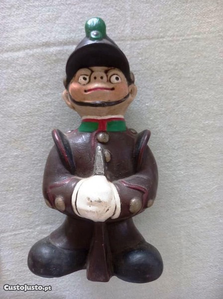 Estatueta em faiança com figura de aluno do Colégio Militar. Decoração relevada e policromada. Assinada na pasta (Carla). Pintado à mão. Peça para coleccionador, pois trata-se, eventualmente de uma caricatura, a julgar pelas feições do rata. Mede, aproximadamente, 24 cm de altura e a base tem 11*9 cm.