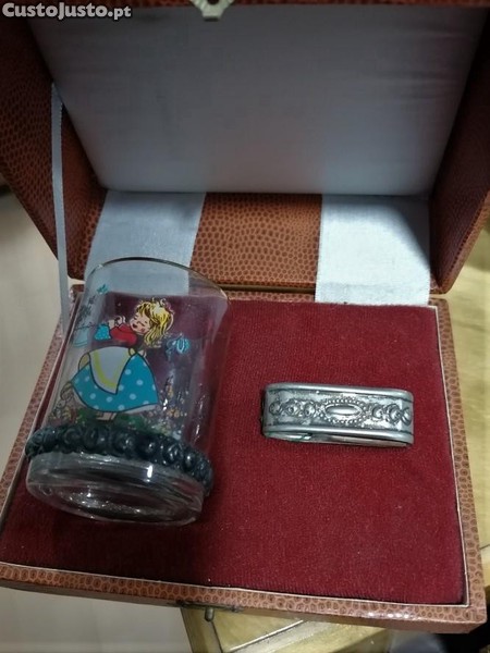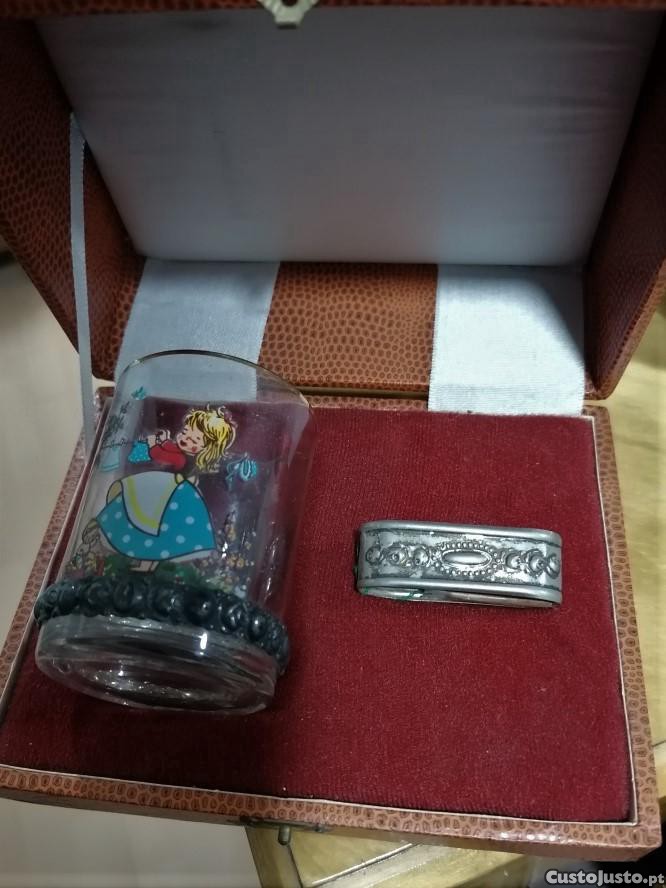 Estojo de criança com copo em vidro e argola para guardanapo em prata, com contraste Aguia 835 e decoração relevada floral.