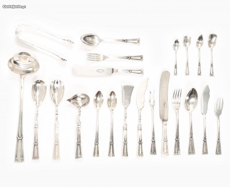 Composto por 12 colheres de sopa, garfos e facas de peixe 12 garfos e facas de carne, 12 colheres, garfos e facas de sobremesa, 12 colheres de chá e de café com respetivas conchas de açúcar, 9 talheres de servir e pinça de gelo.