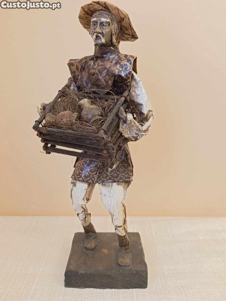 Figura de artesanato homem, com cesto com cantaros, em papel maché, com base em madeira de 9,5cm x 10cm, com 31cm de altura, em bom estado de conservação (ver fotos). Por 20EUR + portes de envio.