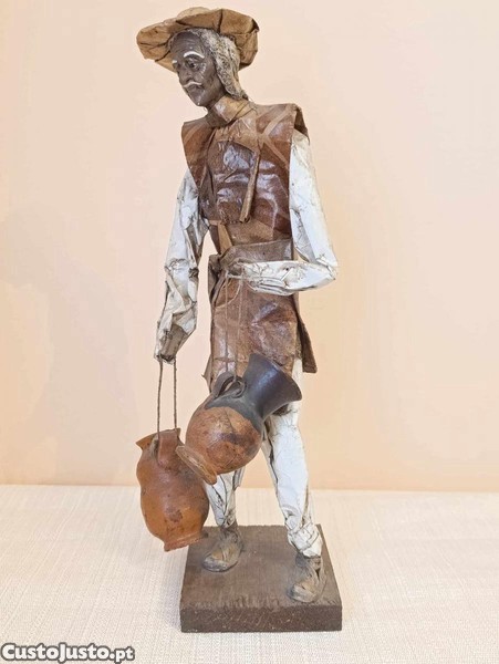 Figura de artesanato homem, com potes barro, em papel maché, com base em madeira de 9cm x 10cm, com 34cm de altura, em bom estado de conservação, consoante pode ver nas fotos.
