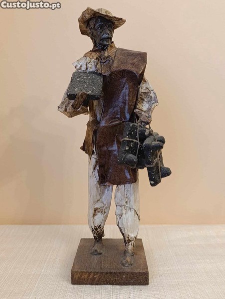 Figura de artesanato homem, com tijolos, em papel maché, com base em madeira de 9,5cm x 10cm, com 34cm de altura, em excelente estado de conservação, consoante pode ver nas fotos.
