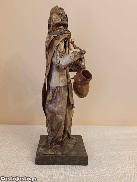 Figura de artesanato mulher, com cantaros barro, em papel maché, com base em madeira de 10cm x 10cm, com 30cm de altura, em bom estado de conservação com pequena falha do papel na cabeça (ver fotos). Por 18EUR + portes de envio.